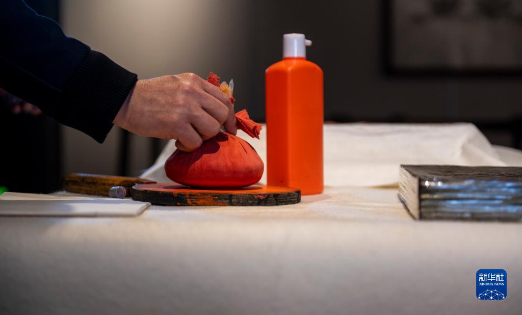 在郑州商都遗址博物院临时展厅里的体验区,李仁清在备墨(11月17日摄)。