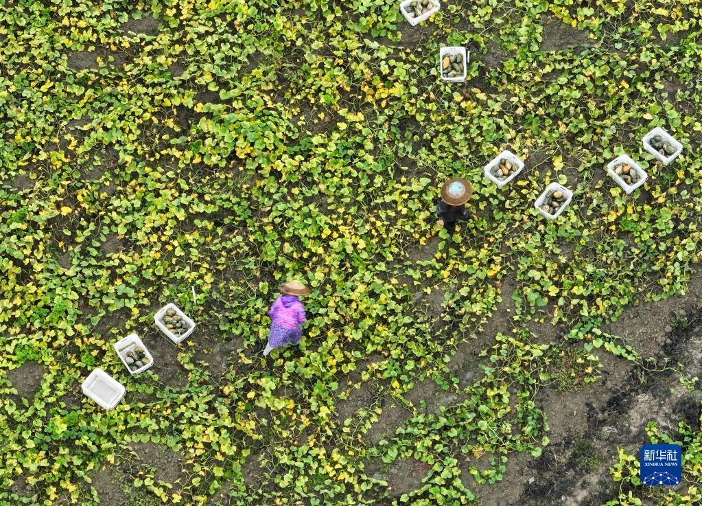 11月22日,湖南省永州市道县一蔬菜基地,农户在采收南瓜(无人机照片)。