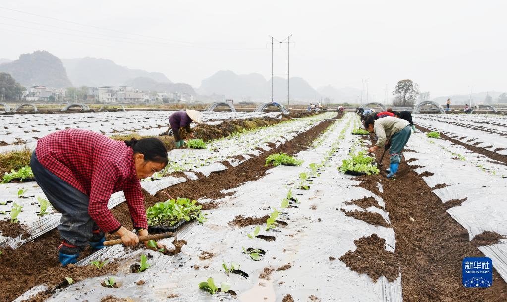 11月22日,湖南省永州市江永县潇浦镇上界头村,农民在移栽包菜苗。