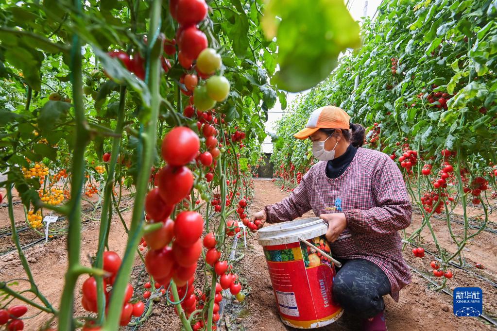 11月22日,在山东省青州市益都街道一农业科技示范园,农民在采收圣女果。