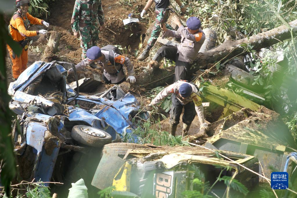 11月22日,救援人员在印度尼西亚西爪哇省展玉地区地震震中附近的山体滑坡现场开展救援。