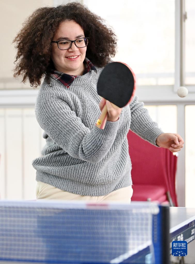 11月20日,艾茉莉在南开大学的一间活动室内打乒乓球。