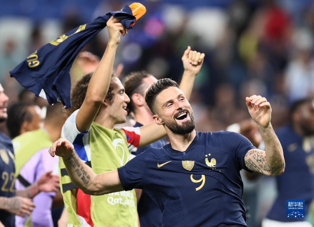 11月22日,法国队球员吉鲁(右)与队友在比赛中庆祝胜利。