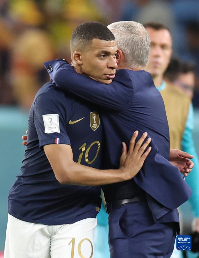 11月22日,法国队球员姆巴佩(左)与主教练德尚在比赛后庆祝。