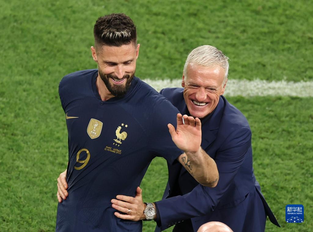11月22日,法国队球员吉鲁(左)被换下后与主教练德尚互动。
