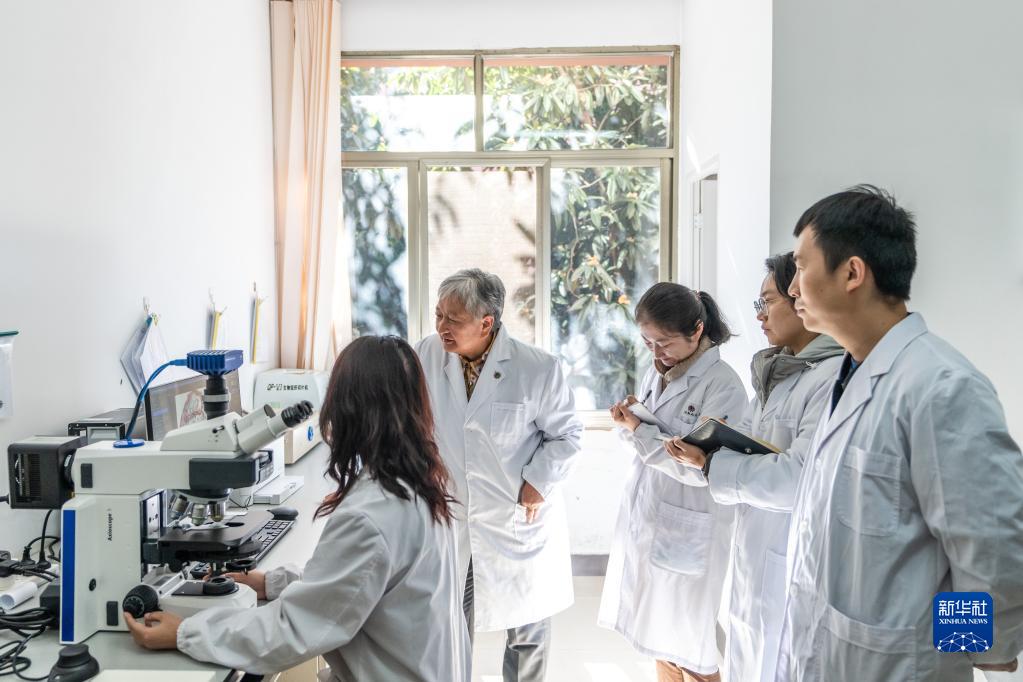 11月22日,朱兆云(左二)在云南省药物研究所实验室指导学员做研究。