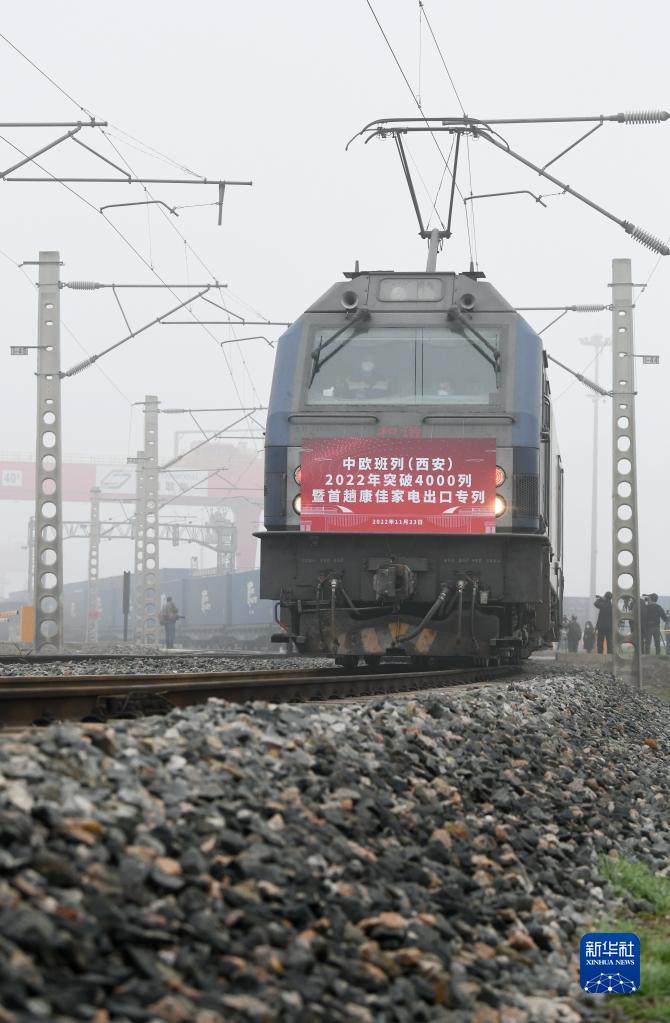 11月23日,满载家电产品的中欧班列从西安国际港站驶出。