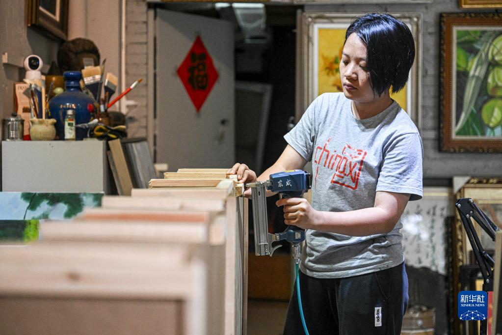 11月23日,一名画师在海南省屯昌县油画步行街打包即将寄出的油画作品。