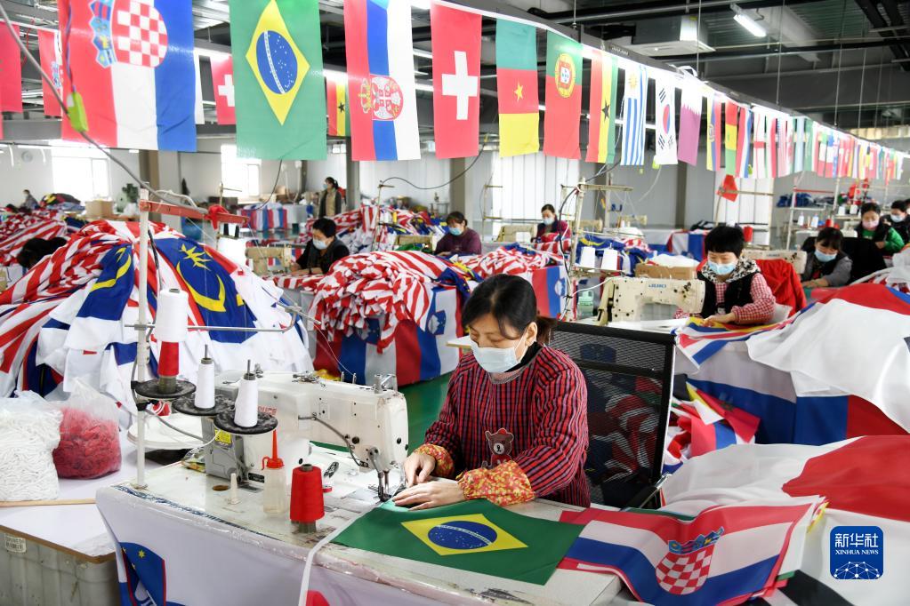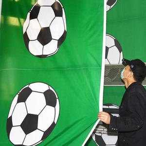 世界杯如火如荼,山东青岛一家专门为世界杯提供旗帜的企业正加紧生产海外客商追加的订单,主要是参赛国国旗、足球标识旗、串旗等,并会随时根据赛况及出线球队变化调整生产计划。