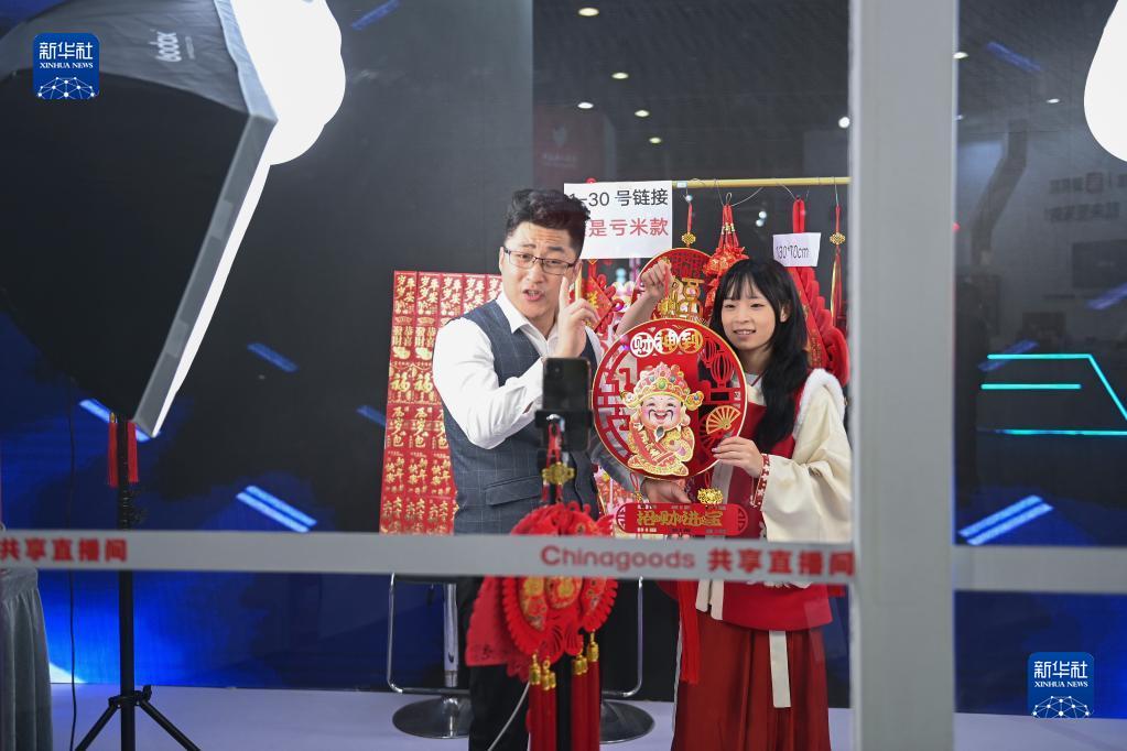 11月24日,参展商在义乌市场建设40周年主题馆的“共享直播间”展区进行直播带货。