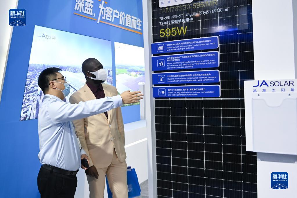 11月24日,在义博会新能源主题展区,参展商(左)向一位塞内加尔客商介绍参观太阳能光伏产品。