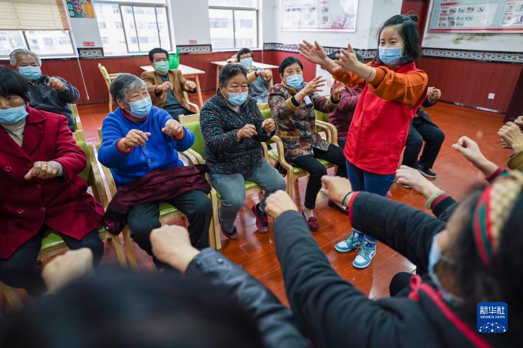 在盐城市亭湖区大洋街道综合养老服务中心,工作人员带领老人练习手指操(11月23日摄)。