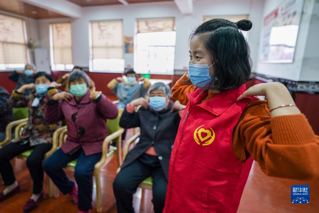 在盐城市亭湖区大洋街道综合养老服务中心,工作人员带领老人锻炼身体(11月23日摄)。