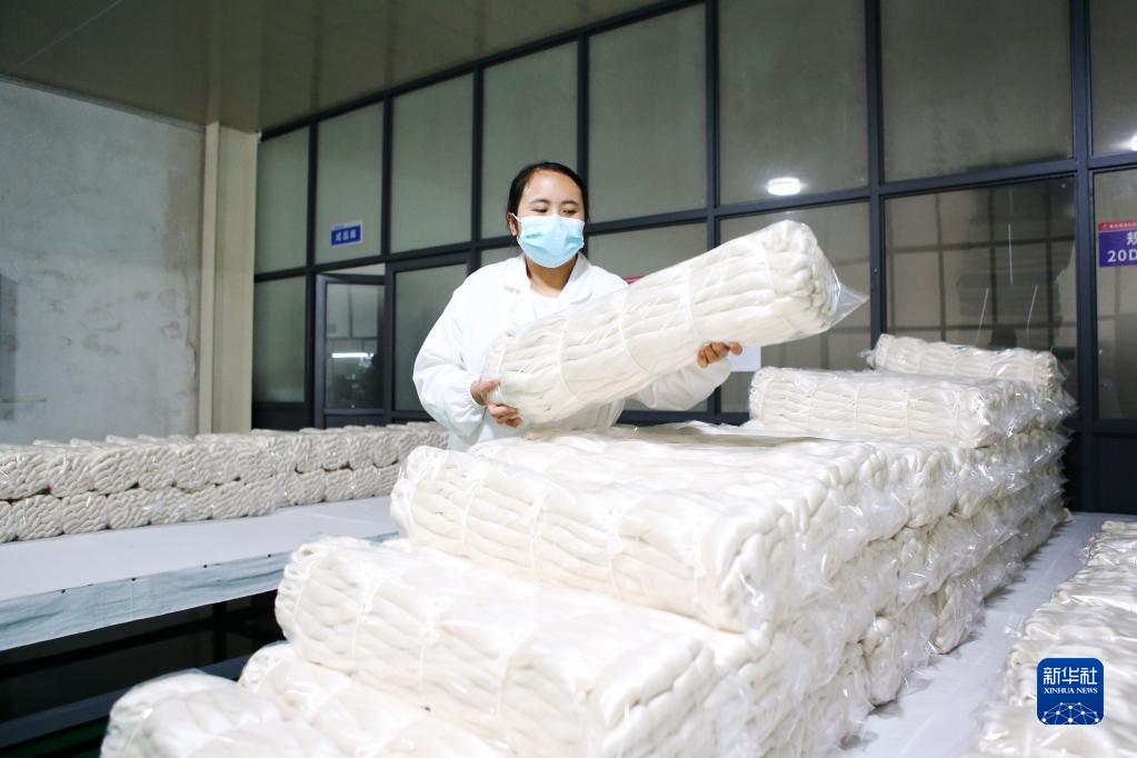 11月23日,工人在重庆市黔江区一家丝绸公司仓库整理生丝。
