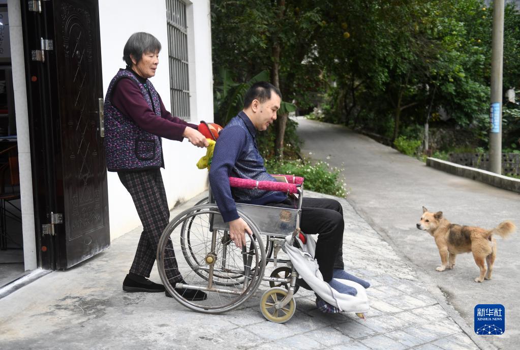 11月24日,在都安瑶族自治县大兴镇九顿村那内屯,77岁的母亲用轮椅推着王金宝出门散心。王金宝受伤残疾后,都是母亲在照顾他。