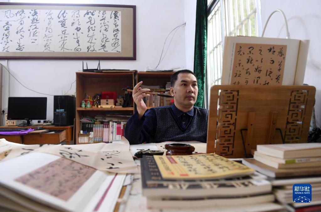 11月24日,在都安瑶族自治县大兴镇九顿村那内屯家里,王金宝在研究字帖。