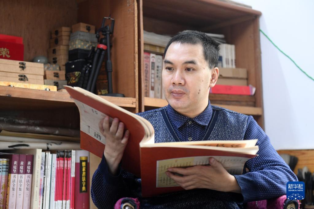 11月24日,在都安瑶族自治县大兴镇九顿村那内屯家里,王金宝在研究字帖。