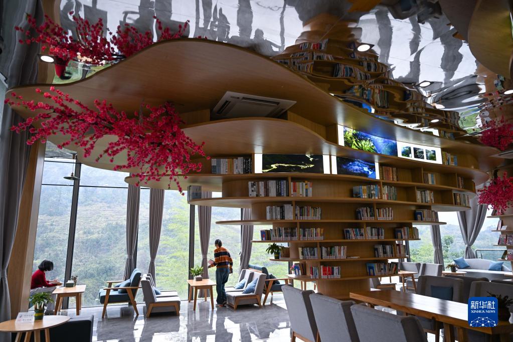 11月24日,游客在浙江省丽水市青田县小舟山乡的城市书房内看书赏景。