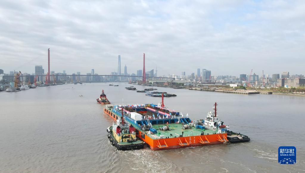 11月25日,装载着长江口二号古船的“奋力”轮航行在黄浦江杨浦大桥水域附近。