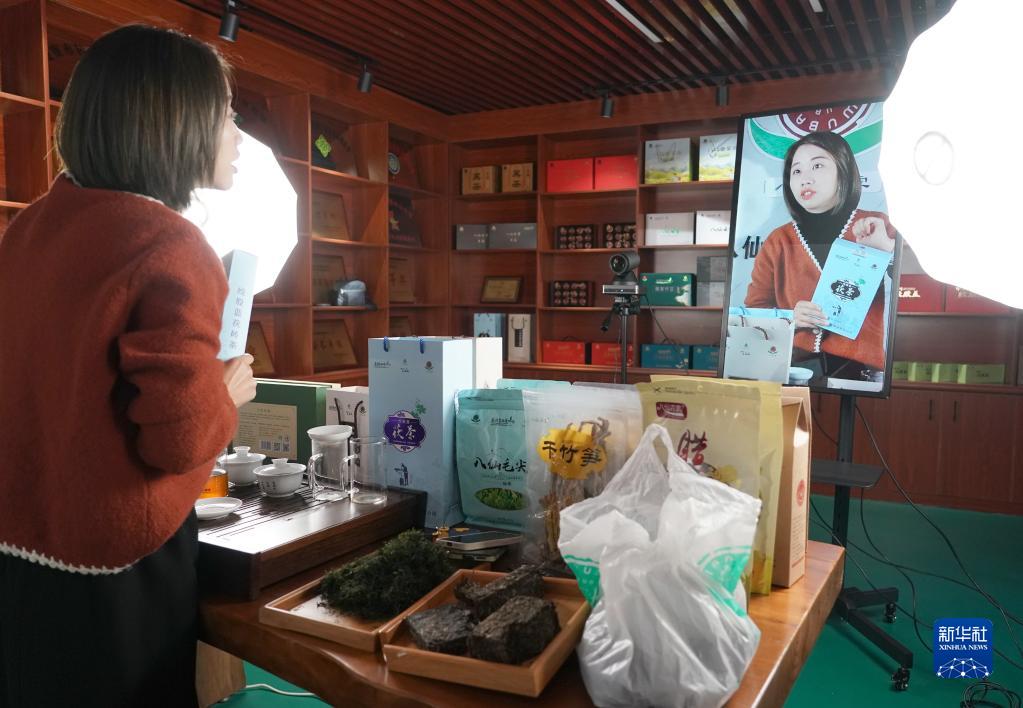 在陕西安康市平利县八仙镇一家茶叶公司,电商主播在介绍茶叶产品(10月21日摄)。