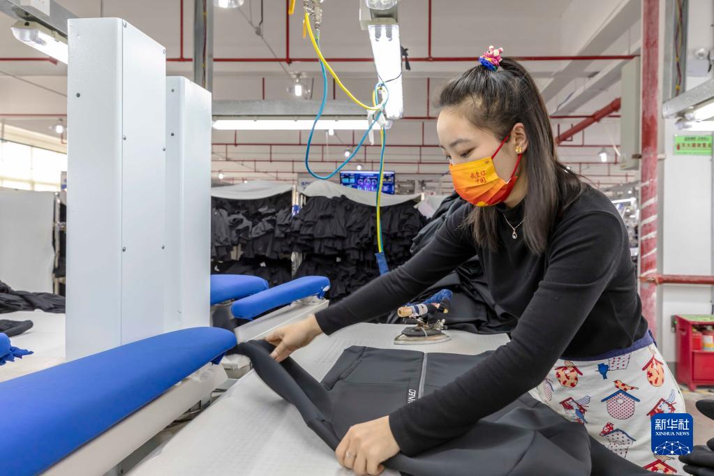 11月25日,员工在贵州省黔西市岔白工业园区一家服饰公司生产车间加工服装。