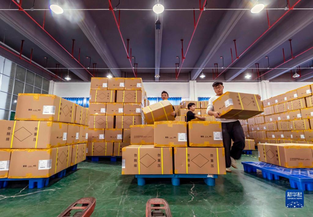 11月25日,员工在贵州省黔西市岔白工业园区一家服饰公司成品仓库分摆成品。