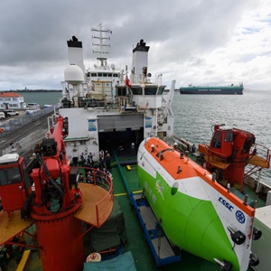 11月27日,中国“探索一号”科考船搭载着“奋斗者”号全海深载人潜水器停靠在新西兰奥克兰皇后码头。