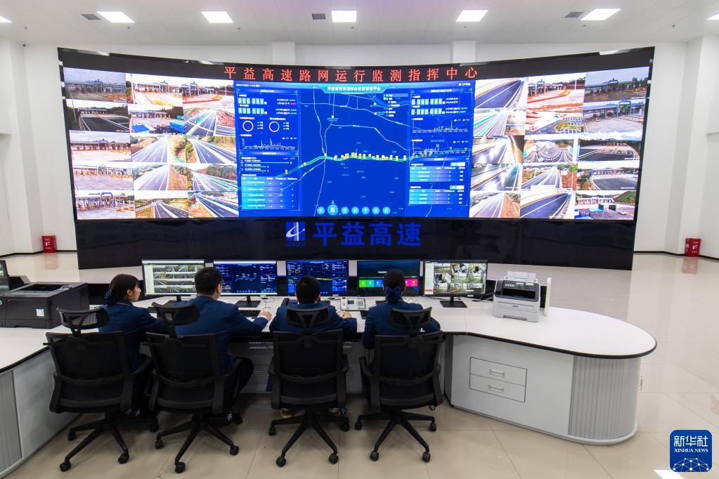 11月28日,工作人员在湖南平益高速路网运行监测指挥中心观察高速路况等信息。