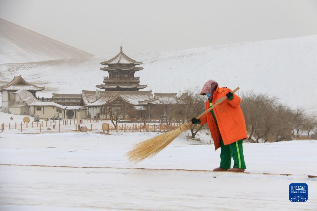 11月28日,保洁人员在甘肃省敦煌市鸣沙山月牙泉景区清理积雪。