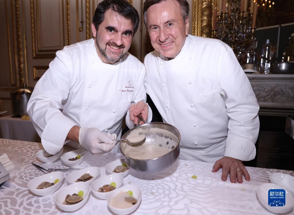 11月28日,在位于巴黎的法国外交部举行的榜单揭晓活动现场,厨师展示其制作的美食——松露饺子。