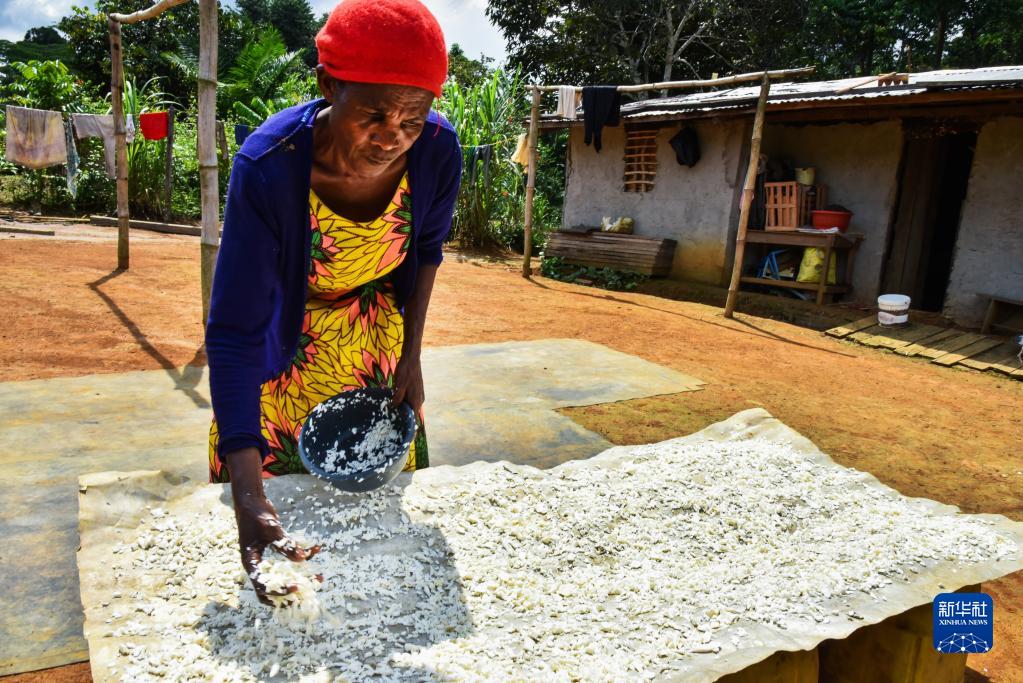 11月16日,在喀麦隆南部大区曼贡市一村庄,一名妇女在晒木薯块。