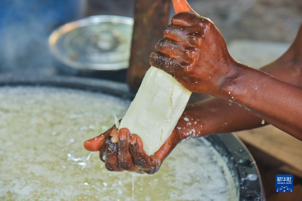 木薯是喀麦隆百姓重要的传统粮食作物。成熟的木薯块根经过清洗、削皮、切碎,再放入水中发酵,根据发酵时间的不同,木薯碎根可以制成不同的衍生品,比如木薯棒和木薯“古斯古斯”。