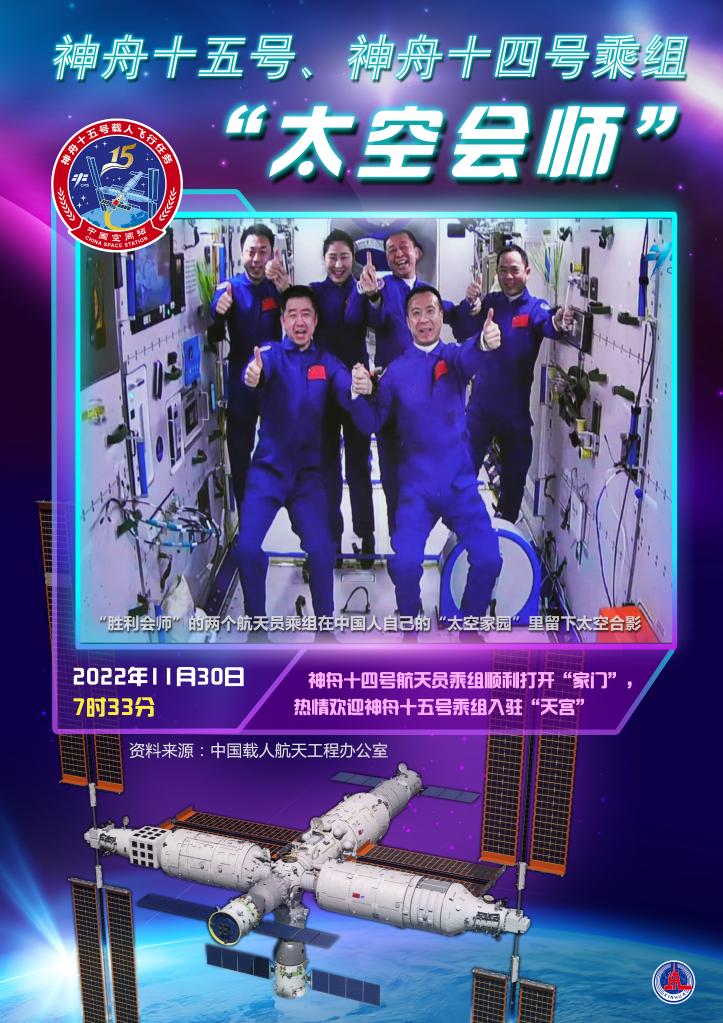 完成各项准备后,11月30日7时33分,翘盼已久的神舟十四号航天员乘组顺利打开“家门”,热情欢迎远道而来的亲人入驻“天宫”。随后,“胜利会师”的两个航天员乘组,一起在中国人自己的“太空家园”里留下了一张足以载入史册的太空合影。