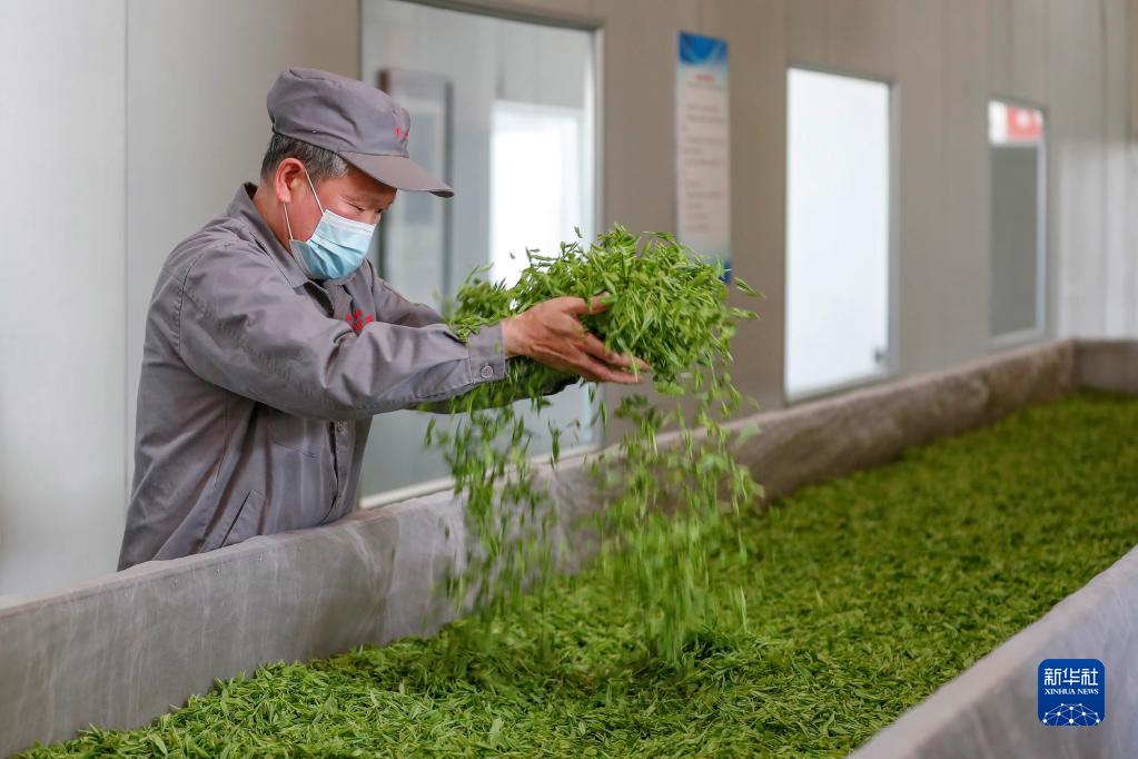 3月28日,祁门红茶发展有限公司的工人在将采摘的鲜叶摊放入萎凋机。