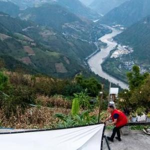 在怒江州泸水市鲁掌镇登梗村,杨明金在安装幕布(2022年10月21日摄)。