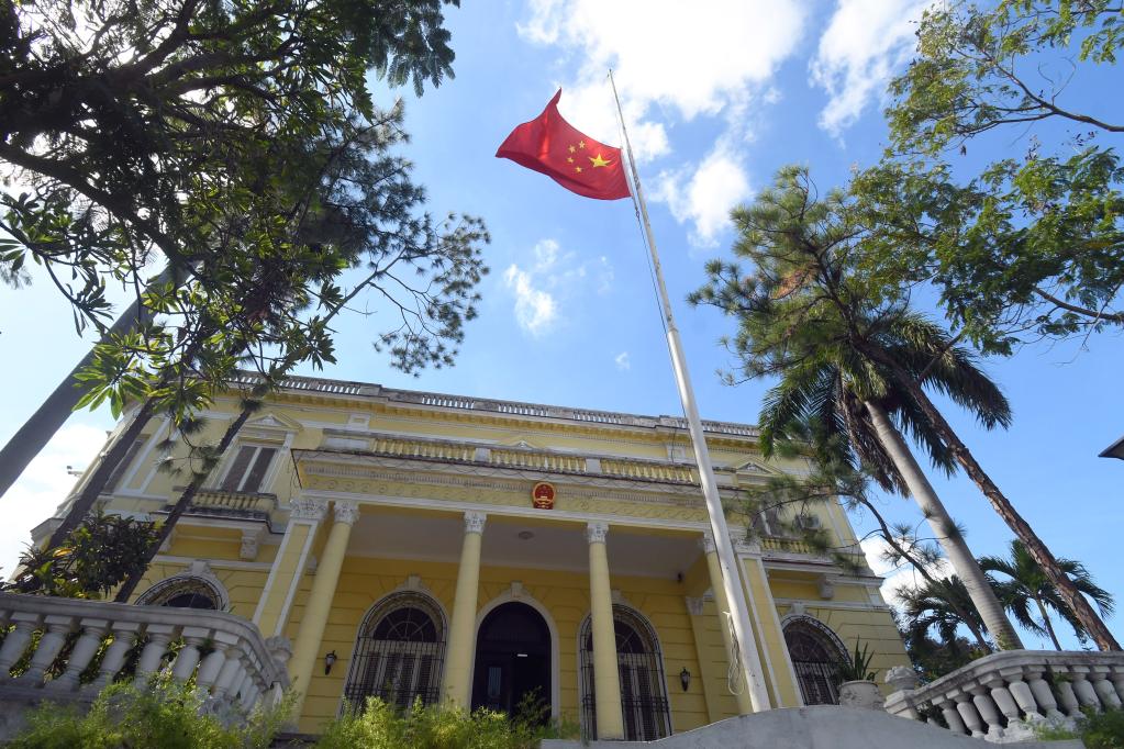 11月30日,中国驻古巴大使馆下半旗志哀,悼念江泽民同志逝世。新华社发(华金·埃尔南德斯摄)