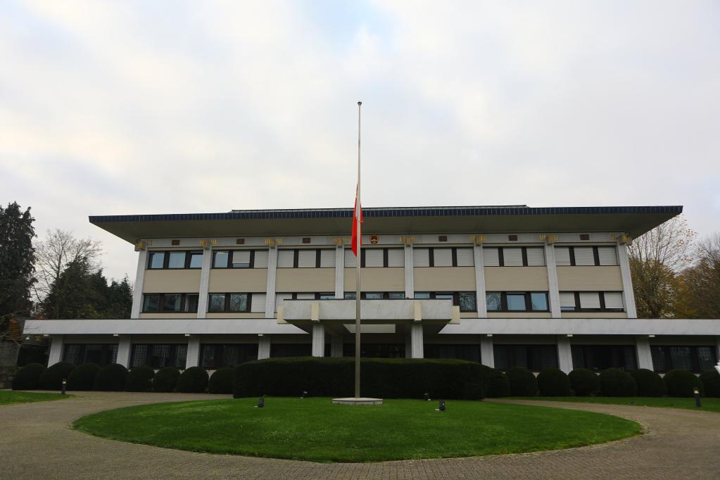 11月30日,中国驻比利时大使馆下半旗志哀,悼念江泽民同志逝世。新华社记者 潘革平 摄