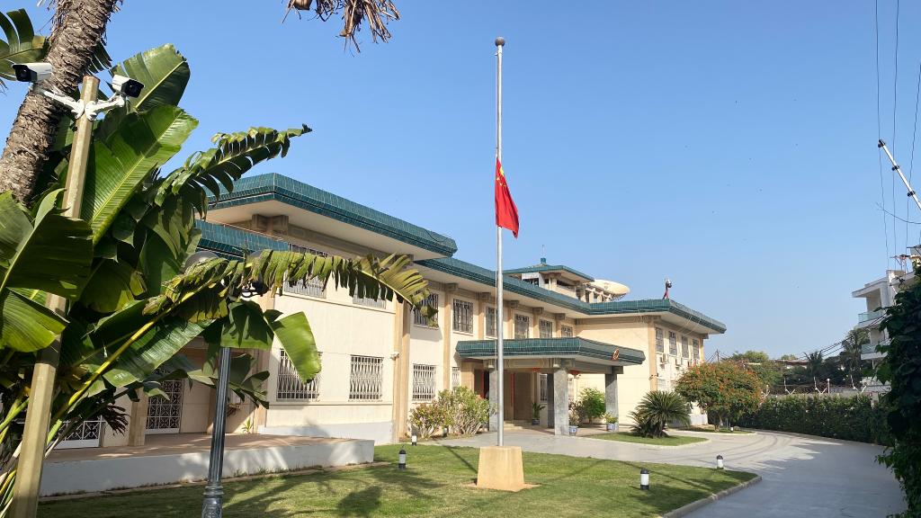 11月30日,中国驻塞内加尔大使馆下半旗志哀,悼念江泽民同志逝世。新华社发(中国驻塞内加尔大使馆供图)