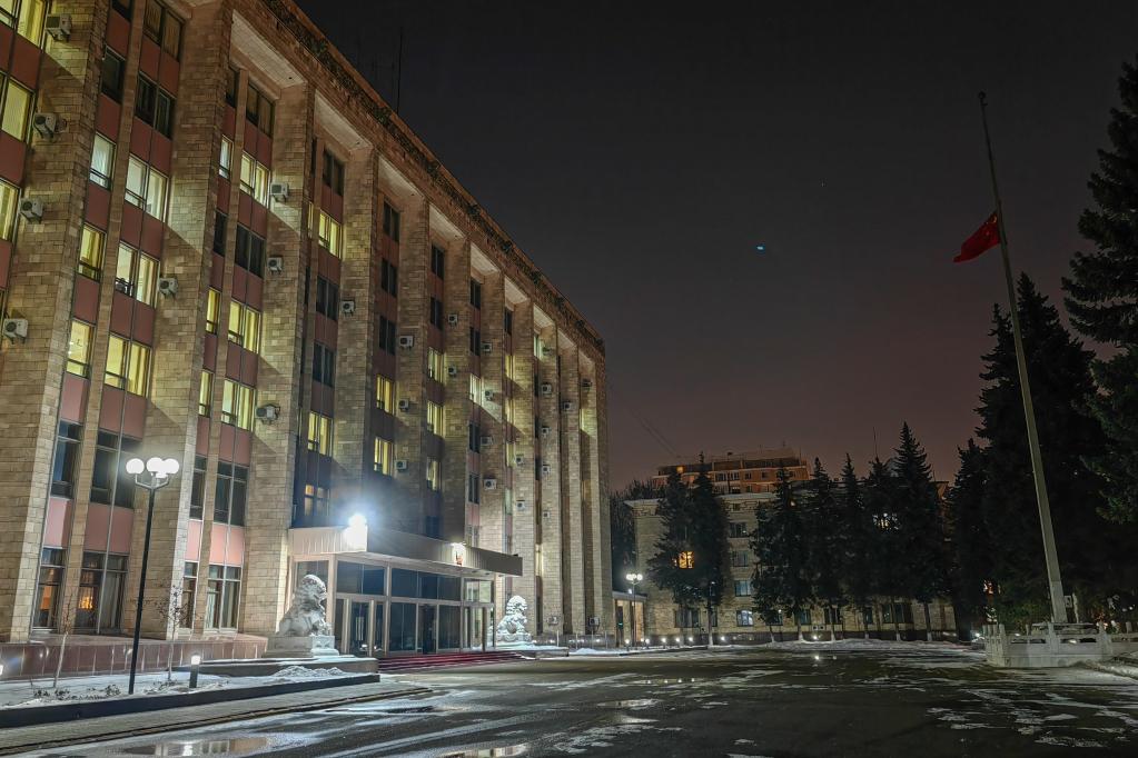 11月30日,中国驻俄罗斯大使馆下半旗志哀,悼念江泽民同志逝世。新华社发(中国驻俄罗斯大使馆供图)