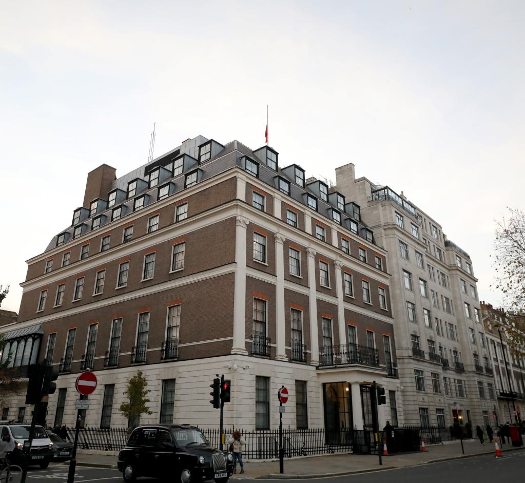 11月30日,中国驻英国大使馆下半旗志哀,悼念江泽民同志逝世。新华社记者 李颖 摄