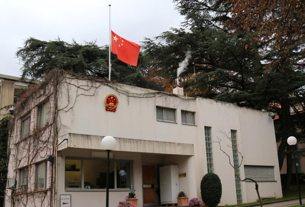 11月30日,中国常驻联合国日内瓦办事处驻地下半旗志哀,悼念江泽民同志逝世。新华社发(陈思琴摄)