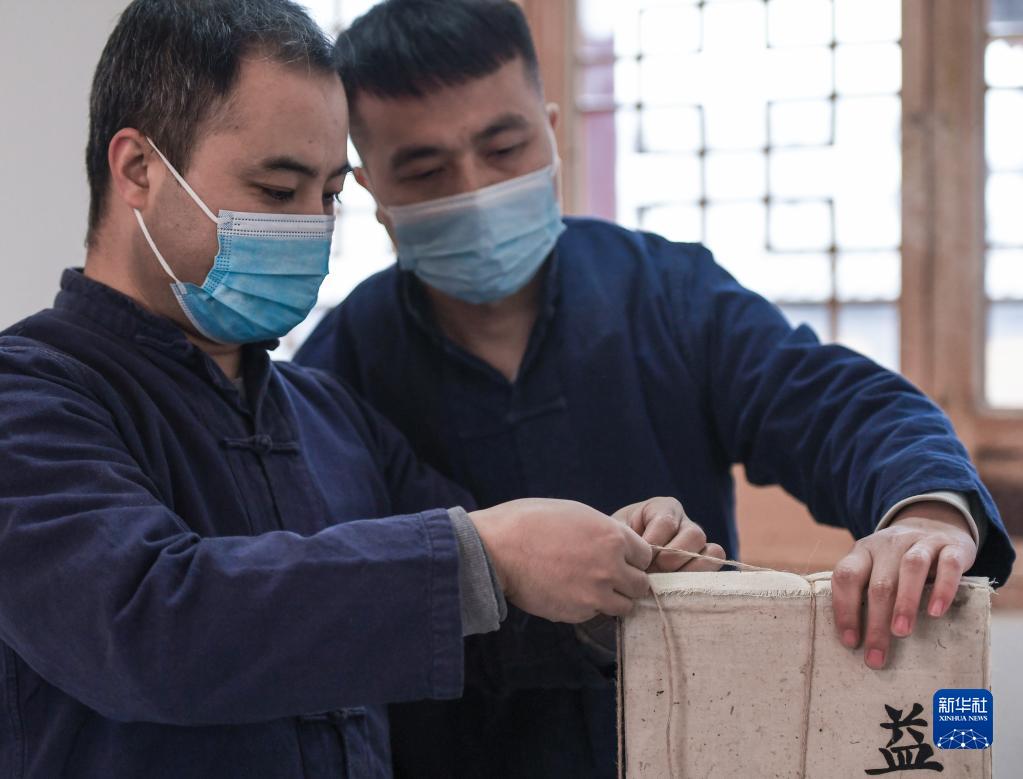 在咸阳“益生源记”仿古茯茶作坊,筑茶师王萌乐(左)、刘林展示捆扎工艺(11月30日摄)。