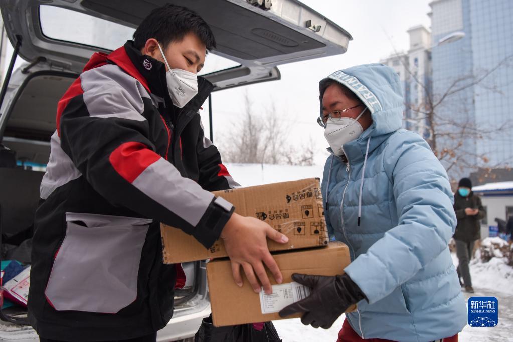 12月2日,在乌鲁木齐市苇湖梁电厂家属院小区门口,顺丰速运的揽投员为居民送货。
