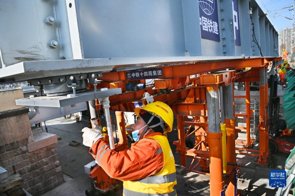 12月5日,中铁十四局建设者在对青岛海岸路钢梁桥进行钢梁更换作业。