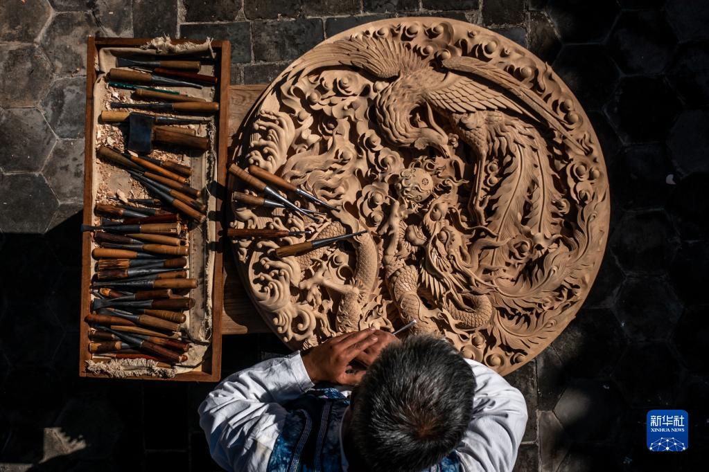 段四兴在进行木雕制作中的修光流程(无人机照片,12月1日摄)。