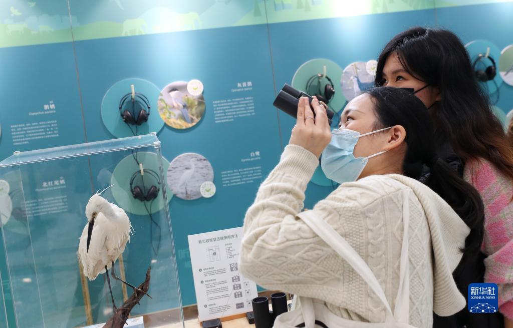 12月7日,参观者在上海自然博物馆体验使用望远镜观看远处的鸟类图片。