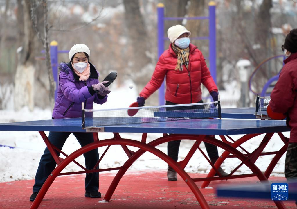 12月7日,在乌鲁木齐人民公园内,市民在打乒乓球。