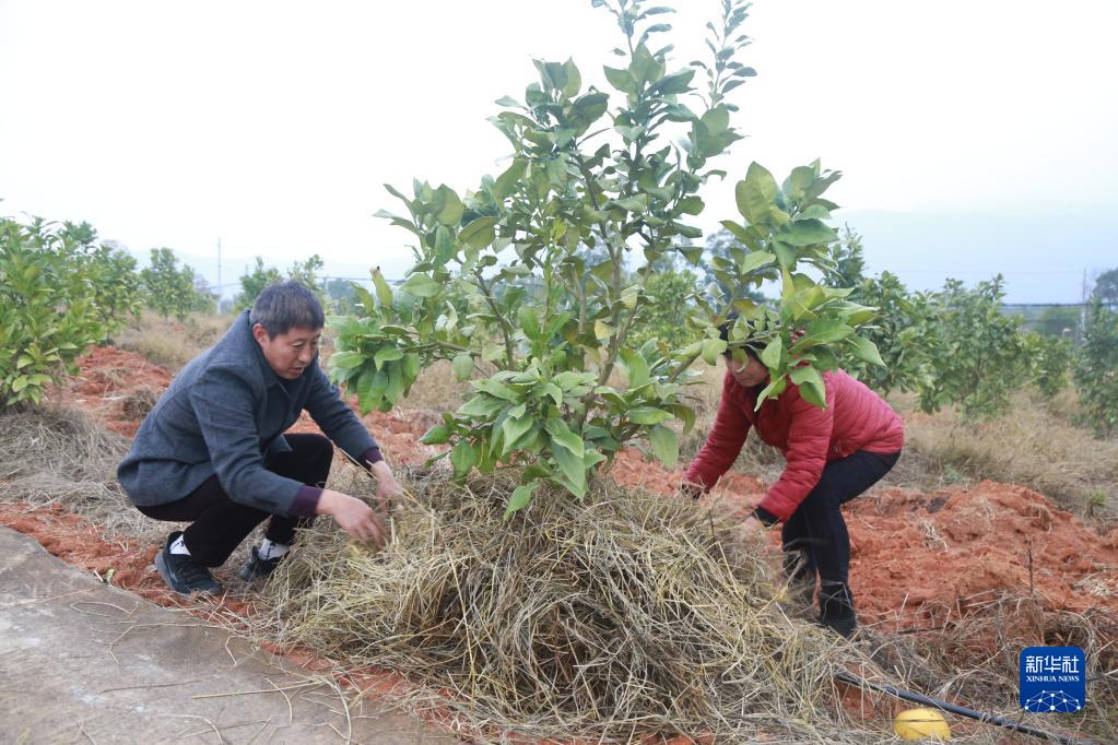 在江西省南昌市安义县长埠镇,当地农户在种养合作社内将秸秆覆盖到果树边(12月7日摄)。这样做不仅保水保肥,还能在冬季起到防冻的作用。