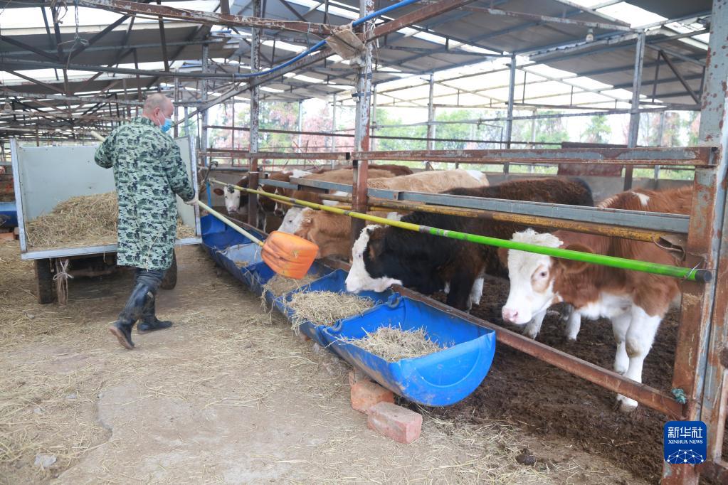 江西省南昌市安义县江西创衍生农业生态有限公司的工作人员正在喂牛(12月7日摄)。