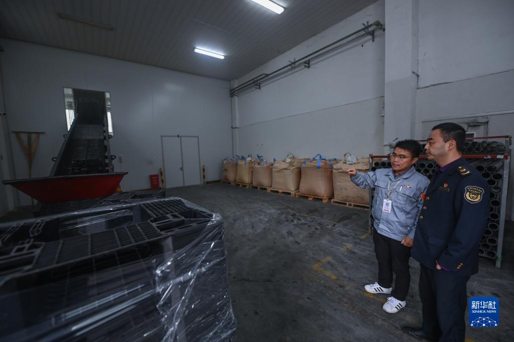 12月9日,在位于杭州市临安区的杭州福斯特应用材料股份有限公司,杭州市生态环境局临安分局的工作人员(右一)了解企业废塑料循环再造的情况。该企业通过自主研发,将企业内部产生的一般塑料固废和废塑料桶制作成塑料托盘,降低了固体废料的排放。新华社记者 徐昱 摄
